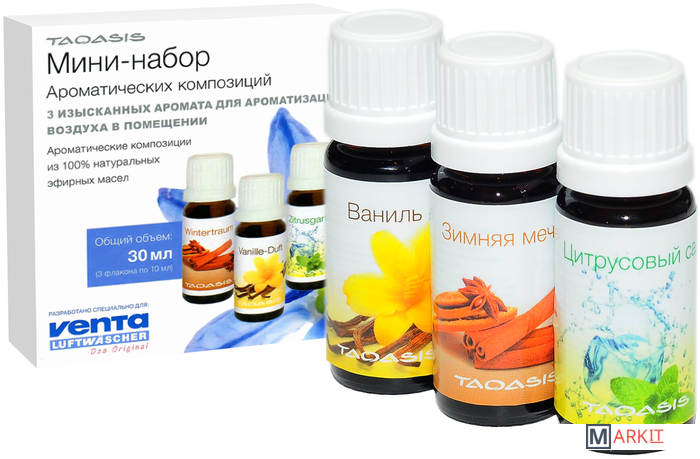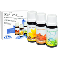 Ароматические композиции: Зимняя мечта, Цитрусовый сад, ВанильМини-набор ароматических добавок - это 3 новых аромата Venta в компактной упаковке (объем каждого флакона аромата - 12 мл).Произведено из 100% натуральных эфирных масел.