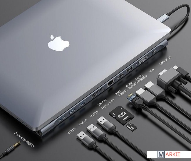 Все разъемы на адаптере USB-A 3.2 Gen1 (5 Гбит/с), HDMI, VGA, RJ-45, USB-C (только для зарядки), 3.5 мм jack