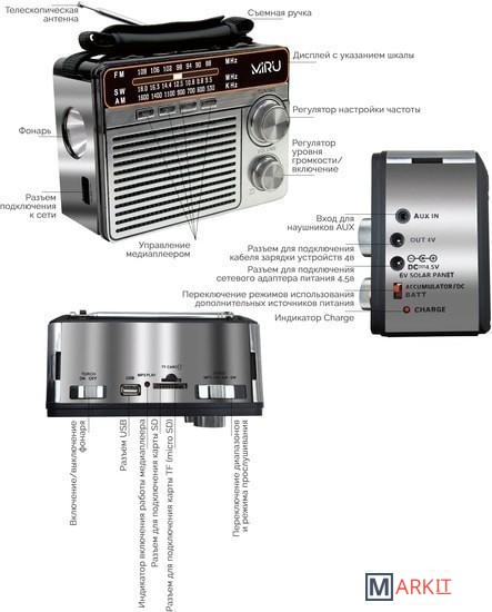 Встроенный аккумулятор: 1200 мАчКомплектация:Радиоприёмник — 1 шт.Шнур питания – 1 шт.Руководство по эксплуатации — 1 шт.Съемная ручка - 1 шт.